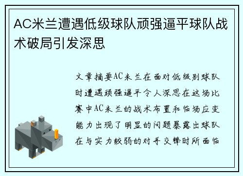 文章摘要:AC米兰在面对低级别球队时遭遇顽强逼平,令人深思。在这场比赛中,AC米兰的战术布置和临场应变能力出现了明显的问题,暴露出球队在与实力较弱的对手交锋时所面临的挑战。本文将从战术执行、球员心理、比赛节奏控制以及对手防守策略四个方面进行...