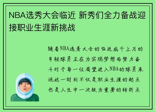 随着NBA选秀大会的临近,成千上万的年轻球员正在为实现梦想而努力奋斗。对于每一位渴望进入NBA的球员来说,这一时刻不仅是职业生涯的起点,也是人生中一次极为重要的转折点。在这一过程中,他们面临着巨大的压力、激烈的竞争和前所未有的挑战。本文将围...