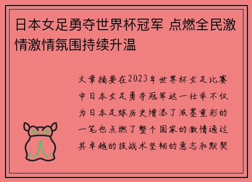 文章摘要:在2023年世界杯女足比赛中,日本女足勇夺冠军,这一壮举不仅为日本足球历史增添了浓墨重彩的一笔,也点燃了整个国家的激情。通过其卓越的技战术、坚韧的意志和默契的团队配合,日本女足展现了强大的竞技实力,成功打破了对手的防线,最终捧起了...