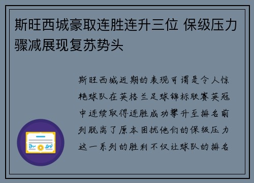 斯旺西城近期的表现可谓是令人惊艳,球队在英格兰足球锦标联赛(英冠)中连续取得连胜,成功攀升至排名前列,脱离了原本困扰他们的保级压力。这一系列的胜利不仅让球队的排名跃升三位,也让球迷们看到了球队在经历了困境后逐渐恢复的希望。本文将从四个方面详...