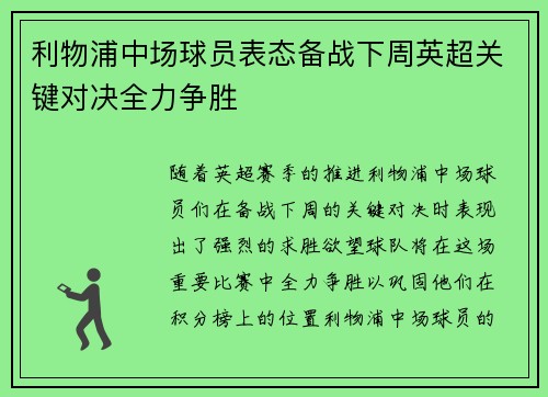 随着英超赛季的推进,利物浦中场球员们在备战下周的关键对决时表现出了强烈的求胜欲望。球队将在这场重要比赛中全力争胜,以巩固他们在积分榜上的位置。利物浦中场球员的表态,不仅体现了他们对比赛的重视,也展现了他们对球队目标的坚定信念。本文将从四个方面详细阐述利物浦中场球员如何备战这场英超关键对决,并分析他们的心态和战术准备。文章将从球员的心态调整、战术准备、团队协作以及对对手的研究等方面进行深入探讨。