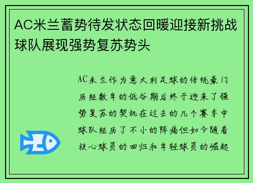 AC米兰作为意大利足球的传统豪门,历经数年的低谷期后,终于迎来了强势复苏的契机。在过去的几个赛季中,球队经历了不小的阵痛,但如今,随着核心球员的回归和年轻球员的崛起,AC米兰展现出了蓄势待发的状态,迎接新挑战的决心已经昭然若揭。本文将从四个方面详细分析AC米兰如何强势回暖并迎接新的挑战,包括球队阵容的优化、战术体系的创新、精神面貌的提升以及青训培养的成效。每一方面都展示了这支曾经的欧洲霸主如何通过努力和智慧走出低谷,迎接新的巅峰之路。
